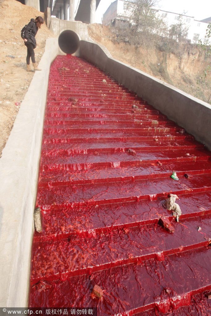 2011年12月13日,洛阳涧河遭到污染,河水变成血红色,穿越市区后流入洛河。次日,洛阳市环保局经过排查,确认源头是两家非法作坊,生产污水直接排放进雨水管网,并流入涧河染红河水。当日,这两家非法作坊被取缔。14日,这两家非法作坊被取缔。图为记者在华山路涧河桥下采集河水水样。