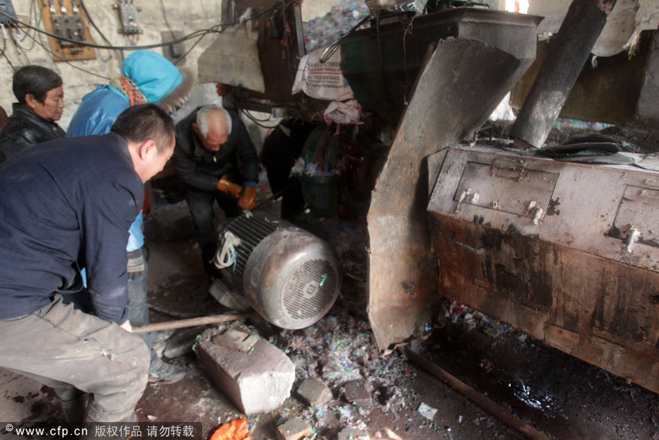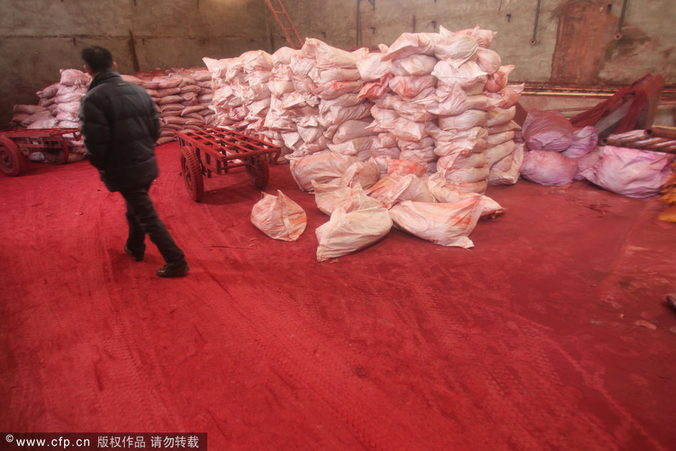 14日,这两家非法作坊被取缔。图为执法人员在查处红色染料源头的非法作坊。
