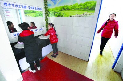 而公厕内部,和普通公厕基本相同,只是铺设着米黄色地板,显得特别干净。课间,不时还有学生值勤,提醒过往的学生注意卫生,节约用水。