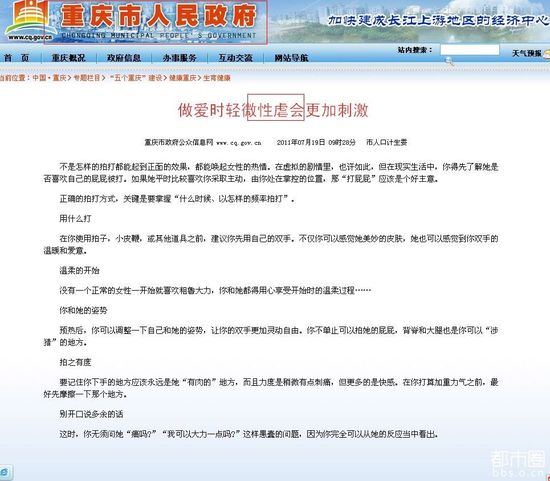 昨天,有网友在重庆市政府网站上竟然发现了一篇指导如何“轻微性虐”的文章。因为文中措辞比较露骨,所以引发了网友的围观议论。有网友调侃说:“这是政府真正介入房事。”昨天下午4点左右,该文章被删除。快报记者多次联系负责网站内容的相关部门,但是电话一直是忙音。
