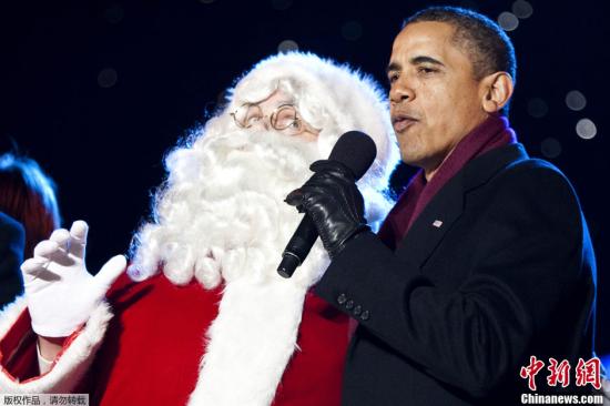 资料图:当地时间12月1日,美国首都华盛顿白宫前,美国总统奥巴马在国家圣诞树点亮仪式现场演唱圣诞颂歌。