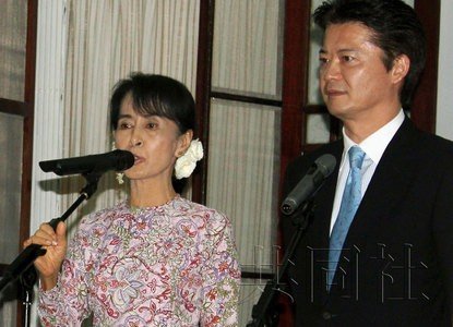 12月26日,日本外相玄叶光一郎在缅甸仰光登门拜访了缅甸民盟领导人昂山素季,并邀请其访问日本。两人在会谈后一同接受记者采访。