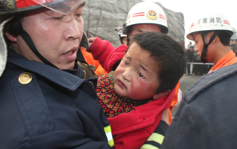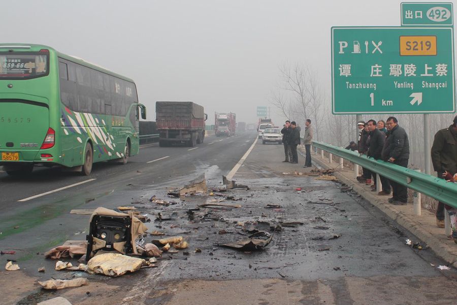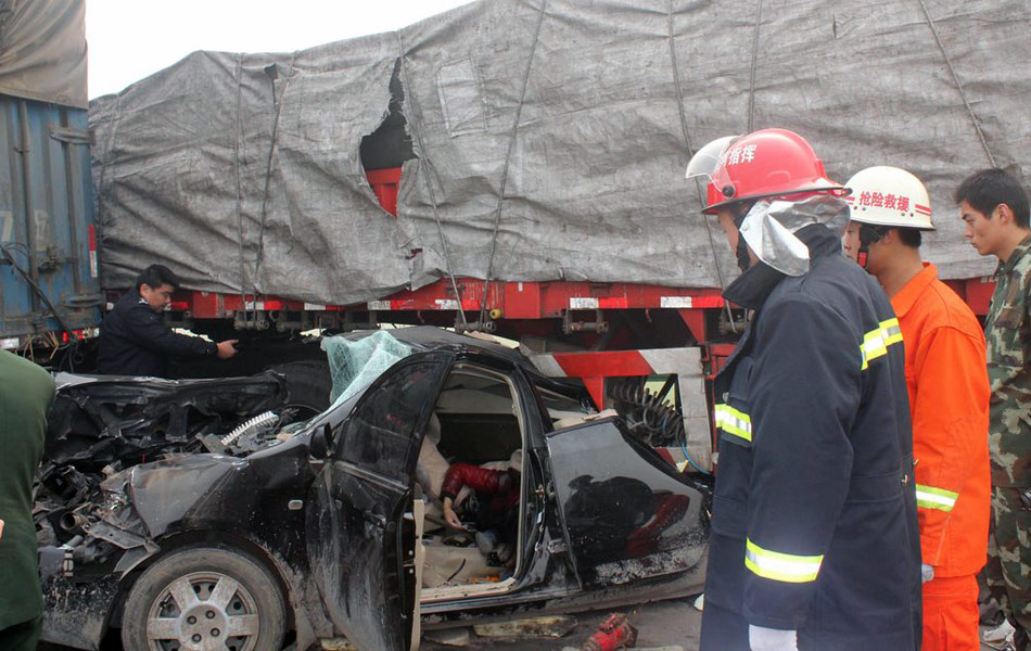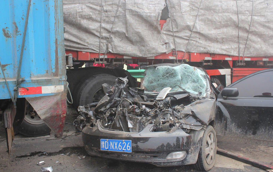 12月28日上午,在南(京)洛(阳)高速公路南京方向河南漯河与周口交界处,大雾引发了多起车辆追尾事故。其中一起车祸中,一辆黑色轿车被前后两辆大货车夹在中间,其中小轿车上的一名女子,在车祸发生的瞬间用身体护住5岁的儿子,结果该女子当场死亡,儿子获救。郭抗抗 摄