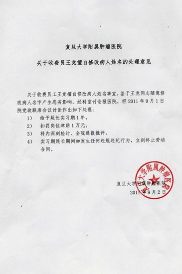 据介绍,2011年8月29日下午,复旦大学附属肿瘤医院财务科收费员王某与安徽患者家属孙某发生口角。事后,王某私自将患者信息调出,将患者姓名改为“张去死”。8月30日,病人家属挂号时,发现打印出的收据上姓名变成了“张去死”,与挂号员说明。挂号员立即核实,并给患者改回了原名,并重新打印挂号收据。家属于当日投诉至院长接待室。