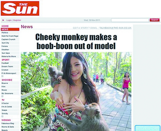 “猴抓妹”美女巴厘岛度假 遭色猴骚扰“春光外泄”