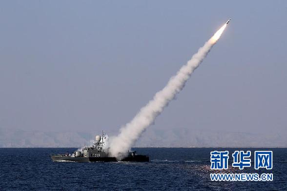 1月1日,伊朗海军在伊南部海域举行的代号为“守卫90”的大规模军事演习中发射一枚导弹。伊朗海军副司令赛义德·马哈茂德·穆萨维1月1日说,伊朗海军在当天的军演中成功试射一枚新型中程地对空导弹。 新华社发(易卜拉欣·诺鲁兹摄)