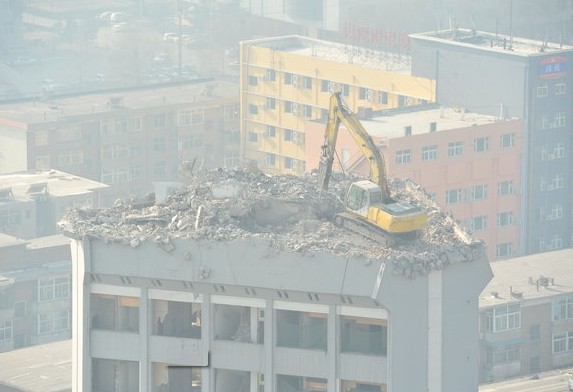 2012年1月5日,山西省太原市万柏林区迎泽西大街,山西科技大厦宾馆顶层,一台挖掘机在楼顶上作业。令周围市民既惊奇又担忧。