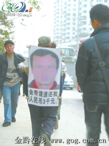 近日,贵州都市网网友“哥是小人”发帖称,2011年12月31日下午5点左右,他经过贵阳市花果园狮峰路口时,看到一位背篼兄弟背着个背篓,背篓上夹着一块木板,上面贴着一名男子的照片,并在照片下面写着:“金X请速还我人民币3千元”。