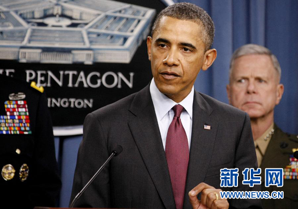 2012年1月5日,在美国首都华盛顿五角大楼,美国总统奥巴马在记者会上发表讲话。美国总统奥巴马当日宣布推出一项新军事战略,表示美国虽然面临预算压力,但将努力确保其“军事超强”地位,同时将美国军事重心转向亚太地区。新华社记者方喆摄