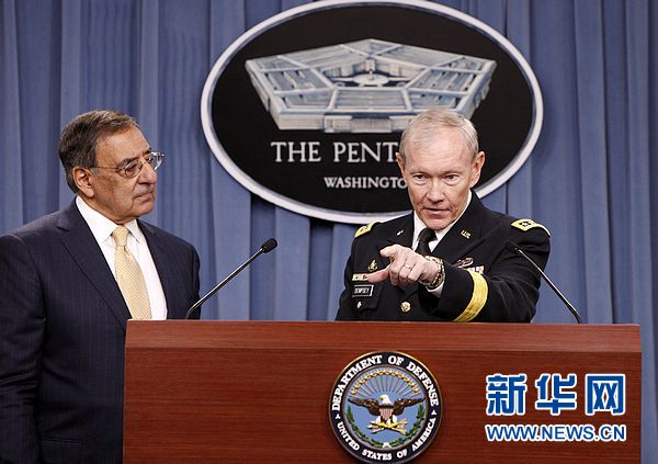 2012年1月5日,在美国首都华盛顿五角大楼,美国参谋长联席会议主席邓普西(右)和美国国防部长帕内塔共同出席记者会并回答记者提问。