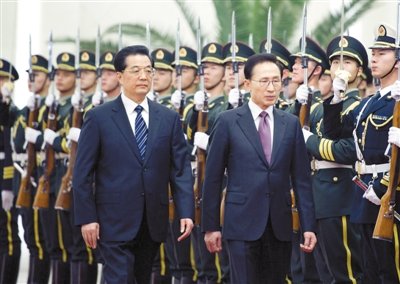 韩国总统李明博访华,胡锦涛与其举行会谈;就朝鲜半岛局势交换意见,称半岛无核化是两国共同目标。
