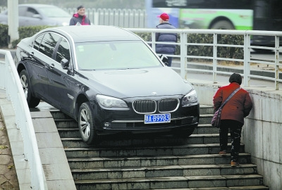 武汉“超牛”宝马开上人行道 走台阶下桥被困(图)