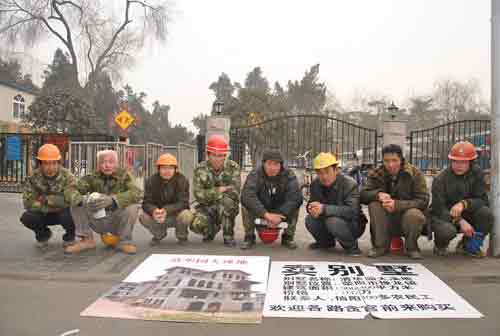 1月13日上午,阴天,雾气氤氲的郑州街头,寒风刺骨,几名衣着单薄的农民工,头戴安全帽,嘴唇冻的发紫,一字排开蹲在地上,面前放着一别墅的“实物效果图”,摆摊叫卖,”别墅”旁边的木板上面写着“卖别墅,别墅面积:300-400平方米,联系人:信阳100多农民工”字样,并表明“欢迎各路贪官前来购买”。几名农民工情绪激动,见有人靠近询问,不时痛苦得直掉泪。