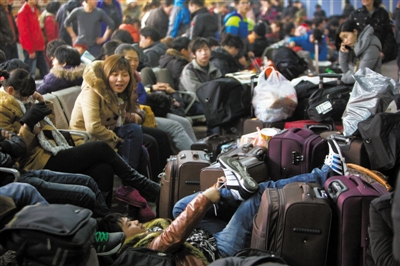 昨日,北京西站,大批旅客在候车室休息。当日,西站发送旅客21.9万人,达到今年春运以来旅客发送最高峰。记者 周岗峰 摄