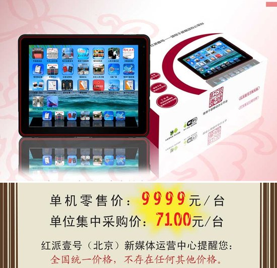 据“红派壹号运营中心”有关负责人介绍,该款定义为新媒体平板电脑的便捷式办公设备,集成了目前最顶级的软、硬件配置,包括A9双核处理器、1G内存、16G存储、1280×800分辨率、7600毫安电池、电容屏手写笔等,配之以体验优越、操作流畅的当今最高版本安卓3.2操作系统,完全满足了高端人士进行移动办公的需要。