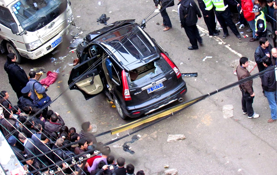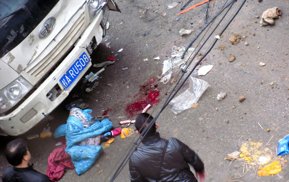广西新闻网讯 1月15日15时30分许,南宁市高峰路47号门前人流密集路段发生一起交通事故,一辆悬挂闽A5M797车牌的本田CRV小汽车突然失控,连续碰撞多名行人,随后撞到路边停靠的一辆货车后才停下。图为事发现场。