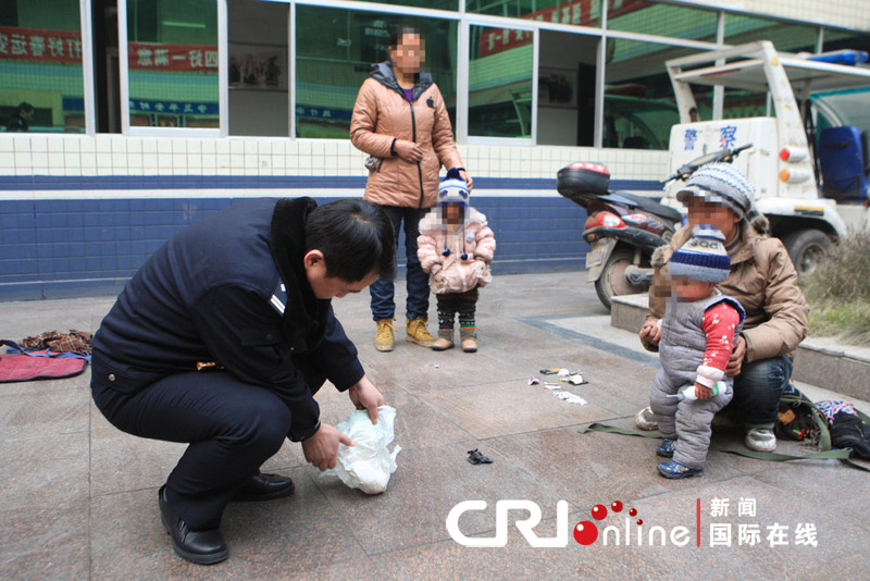2012年1月12日,西安铁路公安处西安车站派出所。严密监视下,办案民警让嫌疑人将孩子的尿不湿取下,配合搜查。