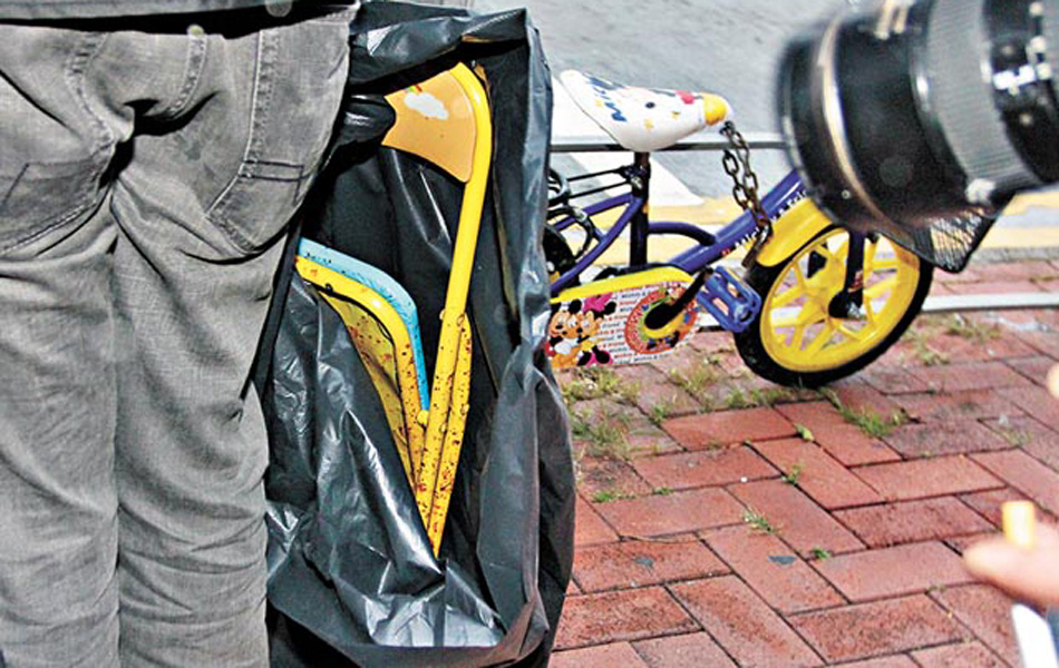约一小时后,陈妻回家,一入屋即吓得面无人色,屋内凌乱不堪,老伴伏在血泊中,满手鲜血的儿子只穿内裤在床上呼呼大睡。她慌忙致电家住新蒲岗的37岁女儿阿冰及女婿到来,两人赶来见陈父已毫无反应,阿冰立刻报警。救护员到场证实陈父死亡,毋须送院。警员发现屋内有打斗痕迹,初步验尸发现凶徒手法残忍,死者头部共十多处伤痕,包括脸、头及后脑,其中后脑被扑至皮开肉绽,估计是致命伤,左手亦骨折,疑挡格摺椅时被打断,稍后剖验以确定死因。图为“凶器”摺椅染满鲜血。