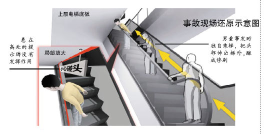 事故现场还原示意图 男童事发时独自乘梯,把头部伸出梯外,酿成惨剧