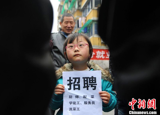 2月1日,杭州江干区外来劳务市场,7岁的贝贝举着招聘启事帮爸爸招工。贝贝的爸爸在杭州开一家餐饮店,年后还没有招到一名员工,店里正等着开业呢。图片来源:东方IC