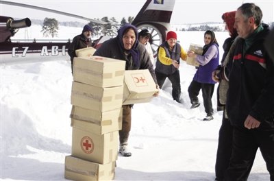 1日,波斯尼亚,直升机为被困大雪中的村民运送食品。