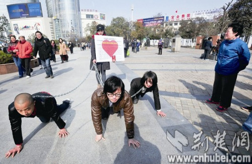 三名年轻男子在地上爬行,脖子上套着狗链,一名年轻女子在后面牵着……昨日(8日)上午10时许,在武昌光谷广场,三名行为艺术者化身“忠实的狗”,来表达对女性的尊重,路过的市民对此看法不一。