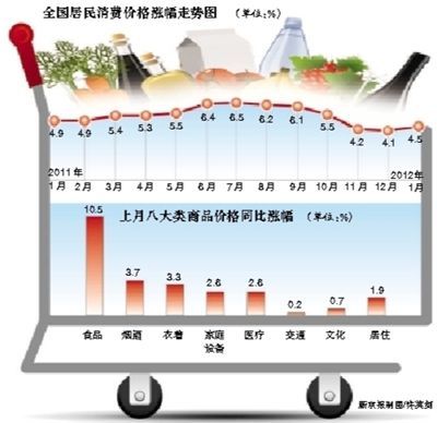 数据显示,从同比看,1月,CPI上涨4.5%,其中食品价格上涨10.5%;影响CPI总水平上涨3.29个百分点。居住类价格涨幅则降低,上涨1.9%,其中住房租金价格上涨2.6%。