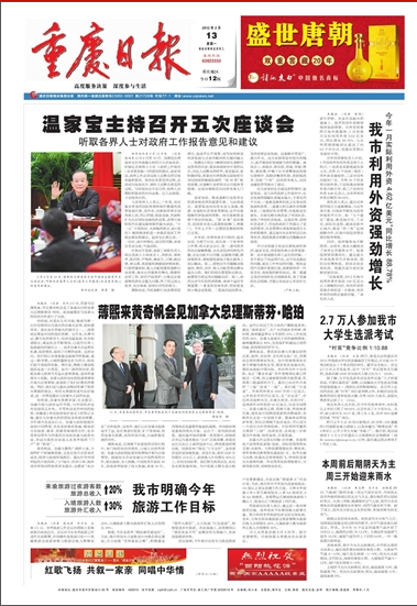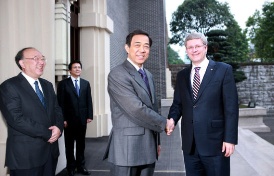 薄熙来说,总理阁下在紧张的访华行程中,专门抽时间访问重庆,山城人民热烈欢迎。加拿大政府把驻重庆领事馆升格为总领事馆,鼓励加方企业加强与中国西部的合作,眼光独到,令人钦佩。中国改革开放前30年,沿海省市取得了很大发展;未来30年,西部将迎来重要的发展机遇期。中国政府高度重视西部大开发,出台了一系列扶持政策。重庆是中国西部唯一的直辖市,胡锦涛总书记为重庆做出“314”总体部署,将重庆定位为长江上游的经济中心,西部重要的增长极。国务院专门制定“3号文件”,支持重庆更好更快地发展。这些年来,重庆GDP年均增长15%以上,财政收入年均增长40%以上,名列全国前茅。我们努力改善民生,优化生态和发展环境。为中低收入群众盖公租房;进行以农民工为主体的户籍制度改革;建设“森林重庆”,在广大的城乡多种树、种好树,森林覆盖率由4年前的33%上升到现在的39%。加拿大是闻名于世的森林国度,森林覆盖率达44%,生态保护和建设方面的经验,值得重庆好好学习。