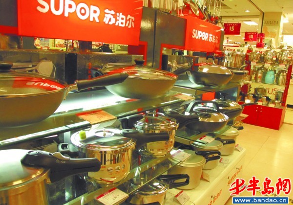 17日晚,在佳世客超市,80多元到700多元的苏泊尔锅具摆满了专柜。 记者 曹凯杰 鲍福玉