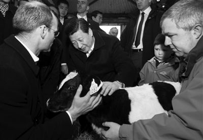 19日,国家副主席习近平在爱尔兰农业部长科文尼(左一)陪同下参观考察爱尔兰詹姆斯·林奇农场。这是习近平在牛圈抚摸前一天刚刚生下的小牛犊。新华社记者 兰红光 摄