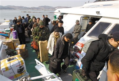 20日,韩国延坪岛,军演结束后,该岛居民乘船返回。
