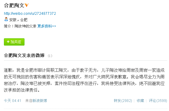 陶汝坤的父亲陶文,25日在新浪实名认证微博称,“我是合肥市审计局职工陶文,由于教子无方,儿子陶汝坤给周岩及周岩一家造成的无可挽回的伤害和痛苦表示深深地愧疚,并对广大网民深表歉意。我会竭尽全力为周岩治疗,陶汝坤已被关押,案件按司法程序在进行,我将接受法律判决,绝不回避我应该承担的法律责任。”