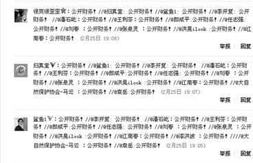 2月25日晚间7时7分,归真堂转发了“亚洲动物基金AAF”的一条微博,同时评论“公开财务!”转发内容显示,创新工场CEO李开复、SOHO中国[5.64 -0.18%]董事长潘石屹、华远地产[4.10 6.22% 股吧 研报]原董事长任志强、零点研究咨询集团董事长袁岳等多人均同样评论“公开财务!”这些评论与此前网友转发归真堂的“滚”字队形一致。