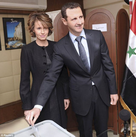 2月26日,叙利亚总统阿萨德携妻子到位于叙利亚国家广播电视台总部的投票站,参加新宪法草案公投。