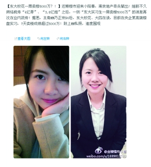 昨天中午,一条“东大校花一周卖楼5000万”的微博爆料引起网友火速围观。微博说,这个女生在东大上大四,在南京某楼盘实习。记者了解到,这是南京中海旗下的楼盘,此前这家楼盘先后爆出“4亿哥”和“3.8亿姐”,如果这名女生的业绩属实,估计她这一个星期能拿到4万元左右的提成。