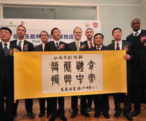 新浪体育讯 2012年3月16日,首届圣殿杯英超足球挑战赛新闻发布会在英国大使官邸正式拉开帷幕。英国驻中国大使吴思田莅临现场、北京市原副市长、市足协主席胡昭广,北京市体育局局长、市足协执行主席李颖川,北京市足球运动管理中心主任、市足协副主席兼秘书长杨俊生等领导,以及北京中奥延旭国际体育文化有限公司总裁王树延、曼城和阿森纳足球俱乐部代表、运动员代表维埃拉、基翁等出席了当天的新闻发布会。