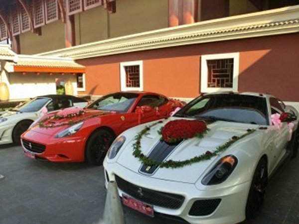 据悉,新郎名叫李波,其父是海南某房地产商,邢利斌则以六辆法拉利做嫁妆。图中戴眼镜穿白衣者为邢利斌。(来源:微博)