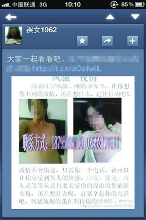 近日,一组关于江宁某单位女员工的不雅照片在微博等网站上广为流传。照片的发布者指名道姓,指图中当事人为南京市江宁区某单位王某(化名),并且以王某的口吻公布了其手机电话和家庭电话。记者昨天采访了解到,当事女子王某确为该单位的工作人员。王某家人表示,这组不雅照极有可能是女儿的前男友所发,目前已就此事报警。