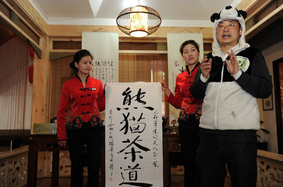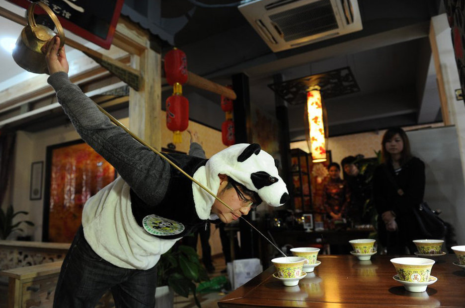 2012年03月27日,四川省成都市,茶馆表演“熊猫茶”茶艺。