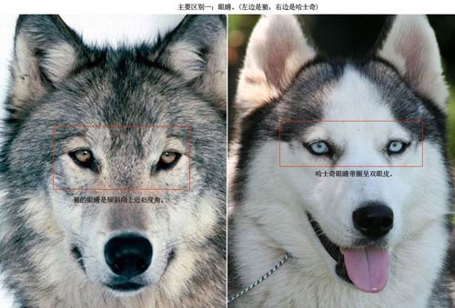 狼的眼睛是倾斜向上45度角,哈士奇眼睛带圈呈双眼皮