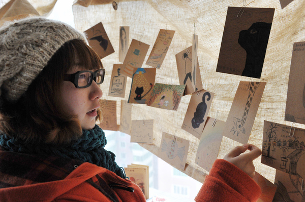照片说明:2月28日,杨艾菁在观看自己画的小插画。