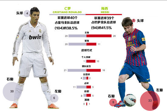 皇马7号和巴萨10号现在进球比西甲历史上任何球员的进球数都多,而他们的进球方式也是各式各样的。C罗在对马竞的比赛中就取得了一个任意球进球,一个远射进球和一个点球进球。在C罗的40个进球中,11个是点球,2个是任意球进球,1个是个人单打独斗的结果,21个是集体配合进球,还有5个是抓住机会补射射门。进球部位方面,头球进球4个,右脚进球30个,左脚进球6个,帽子戏法、梅开二度对C罗来说都是家常便饭,平均73分钟他就能取得一个进球,这样的数据是一般的前锋根本无法达到的。