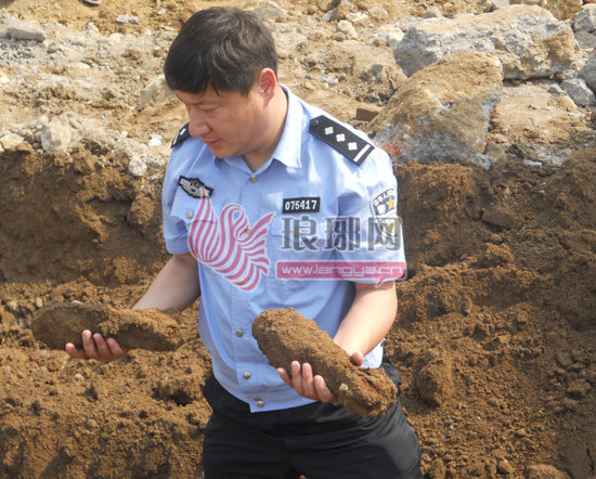 执勤的民警拿走挖出的航弹。