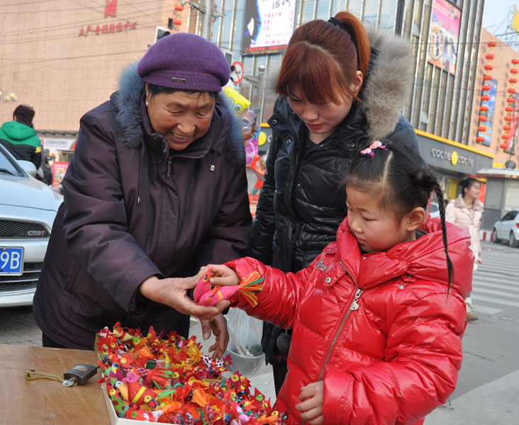 立春之日,在鲁南一带有戴“春鸡”讨吉利的习俗,人们把公鸡饰品钉在儿童的衣袖或帽子上,俗称戴春鸡儿。过了腊月初五,临沭县的民间艺人郑成花就把用彩色布料缝制好的“春鸡”拿到市场上卖,小的三元钱一对,较大的五元钱一双,将近二十天的时间能挣几百元钱。