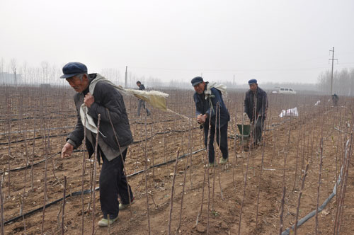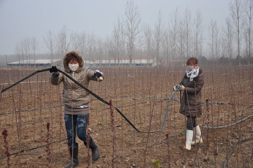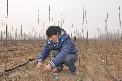 据了解,海棠苗木具有婀娜多姿,树形优美,成活率高,生长迅速的优点,嫁接后经过浇水施肥等管理,只需一年时间就能出售。一棵海棠树苗购进只需一元的成本,在地里长上两年就能值20~30元。去年春天,郑山居两委通过转方式调结构,流转土地200多亩在村北发展起海棠绿化苗木基地,通过网上订单销往全国各地,预计今年底实现产值1000多万元。图为郑山街道郑山居农民在海棠苗木基地忙管理。