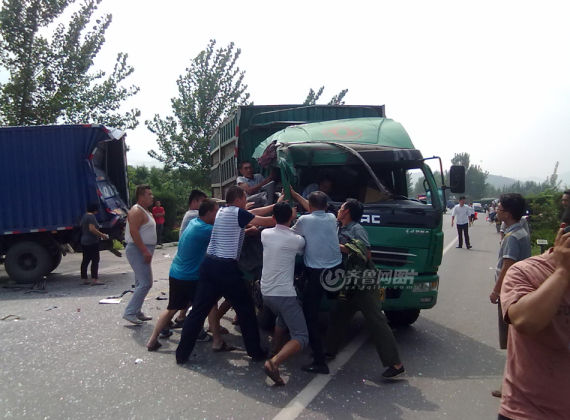 8月13日下午2:30左右,山东205国道蒙阴陡山段发生一起两货车追尾事故,造成三人被困,其中一名男子被困驾驶室,另外两名女子被困货车底部,三名伤者受伤严重,现场情况十分紧急。此时,现场路过群众自发组成救援队伍,几分钟后近百名周围群众加入救援,先后将被困货车底部的一名五旬女子与驾驶室男子合力救出。由于另外一名女子被困货车底部无法脱身,现场无救援设施,近百名群众合力将货车抬起,把另外一名被困女子救出。事故现场,百名群众自发组成救援队伍,合力抬车救人,上演感人一幕。