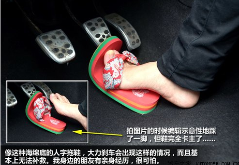 如果是很软的人字拖,在踩踏板的时候发生变形也更危险了,我身边的朋友曾经亲身经历过,踩刹车的时候软质的人字拖鞋底折成了90度,卡在了刹车和地板之间,脚是踩不下去也抬不起了,听着都后怕。对于拖鞋,不仅是女士需要注意,夏天喜欢穿拖鞋开车的男同胞也要重视。