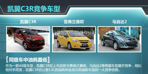 即将推出的凯翼C3R是目前在售凯翼C3车型的两厢版,不仅在外观造型和内饰工艺上进行了优化,同时在加速性能和燃油经济性上也实现了全面升级。,凯翼C3R在经过对油门踏板、ECU数据、空调启停等优化措施后,其百公里综合油耗为5.6L。相比于雪佛兰赛欧两厢的5.7L/100km和马自达2的6.5/100km,凯翼在油耗方面略胜对手。