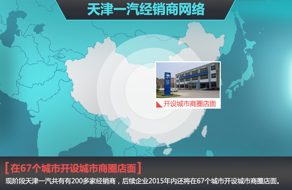 在推出新车型的同时,天津一汽还对发展经销商进行了规划,以提振销量。天津一汽汽车销售有限公司总经理黄春明表示:目前天津一汽共有200多家经销商,后续企业2015年内还将在67个城市开设城市商圈店面。在针对城市商圈铺设经销商网络,这是许多车企正在采取的措施,有利于提高购买成功率,随着经销商网络的铺开,天津一汽整体的竞争力有望上升一个层次。