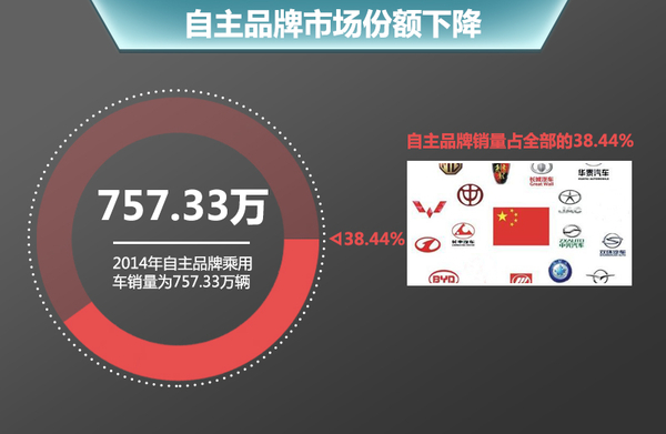 回看2014年中国车市,自主品牌市场占有率曾经出现令人尴尬的12连跌。数据显示,2014年自主品牌乘用车销量为757.33万辆,市场占有率同比下降2.14个百分点,仅为38.44%,合资品牌对自主品牌的市场挤压现象相当突出。此次天津一汽推出新车和扩充经销商网络,应该是力图改变这一现状的举措。